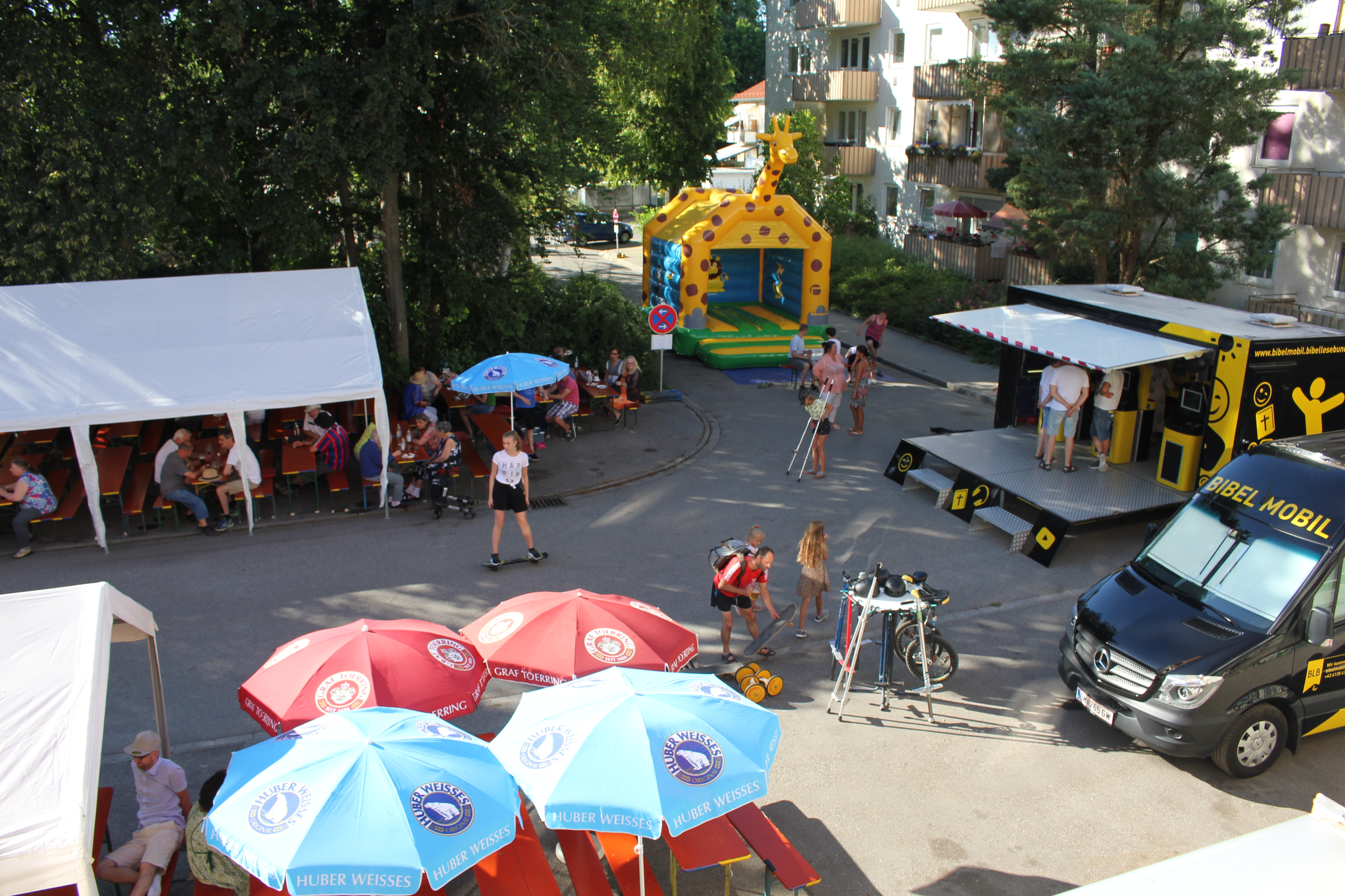 Doch nicht nur die Erwachsenen kamen auf ihre Kosten, sondern auch die Kinder. Ein besonderes Highlight war sicher das Bibelmobil. Zwei Mitarbeiter des Bibellesebundes waren damit extra aus Österreich angereist. Im Gepäck hatte das Bibelmobil nicht nur eine Hüpfburg, sondern ebenso einen Megakicker, Holzbausteine und zahlreiche Monitore, an denen man in verschiedenen Spielen die Bibel entdecken und mehr über Gottes Wort erfahren konnte. Für das leibliche Wohl war bestens gesorgt. Es gab zahlreiche Kuchen, aber auch deftige Speisen, die von Achims Futterkiste zubereitet wurden. Obwohl die Besucherzahl in diesem Jahr überschaubar blieb, wurde bis 20.00 Uhr fröhlich gefeiert. An dieser Stelle noch einmal herzlichen Dank an alle, die sich in irgendeiner Weise eingebracht und so dazu beigetragen haben, dass unser Straßenfest ein schönes Erlebnis wurde.